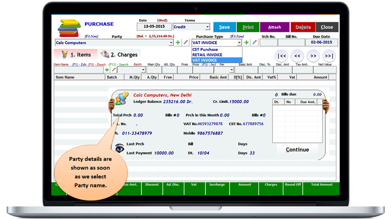 4. Select Party from whom items are purchased.