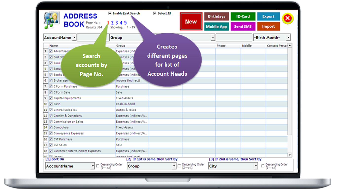 1. Click on Account option in the right side menu or top menu on the above screen. We see the list of all the created account heads in Address Book.