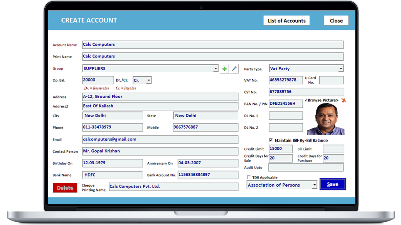3. Type all the details like Address, Contact, Registration, Licensing, Financial Year etc.Type them accurately as they will reflect in all the bills.