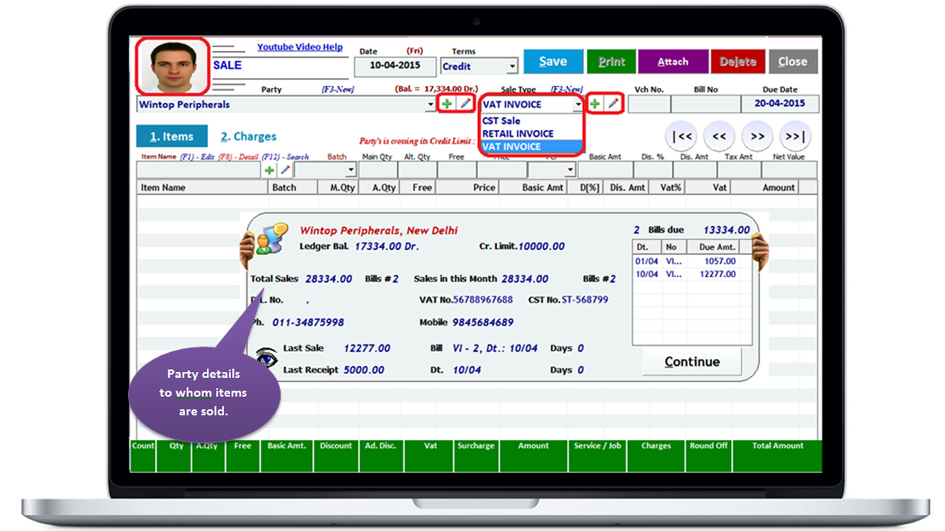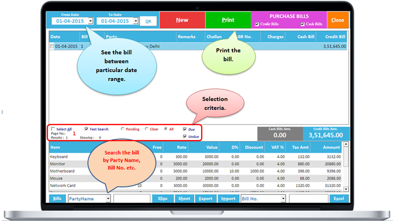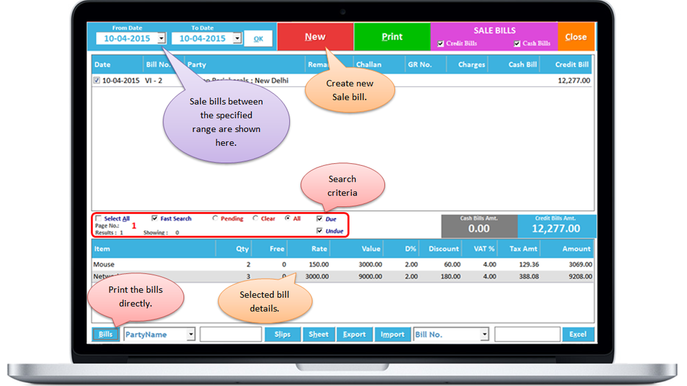 2. Check all the Sale bills in a particular period and their details. You will see which items you have sold to which party and the amount of the bill, whether the bill is of Cash or Credit. Other Charges are also shown.