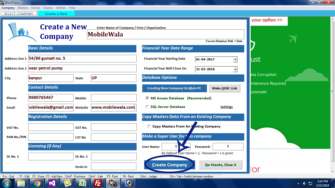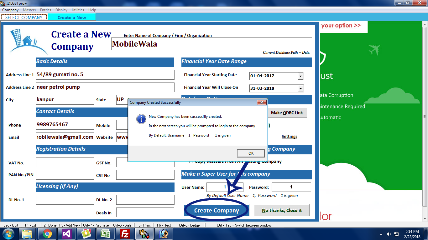 By default, User Name and Password is set to ‘1’. Change it if you wish.Click Create Company to save all the details of a New Company.